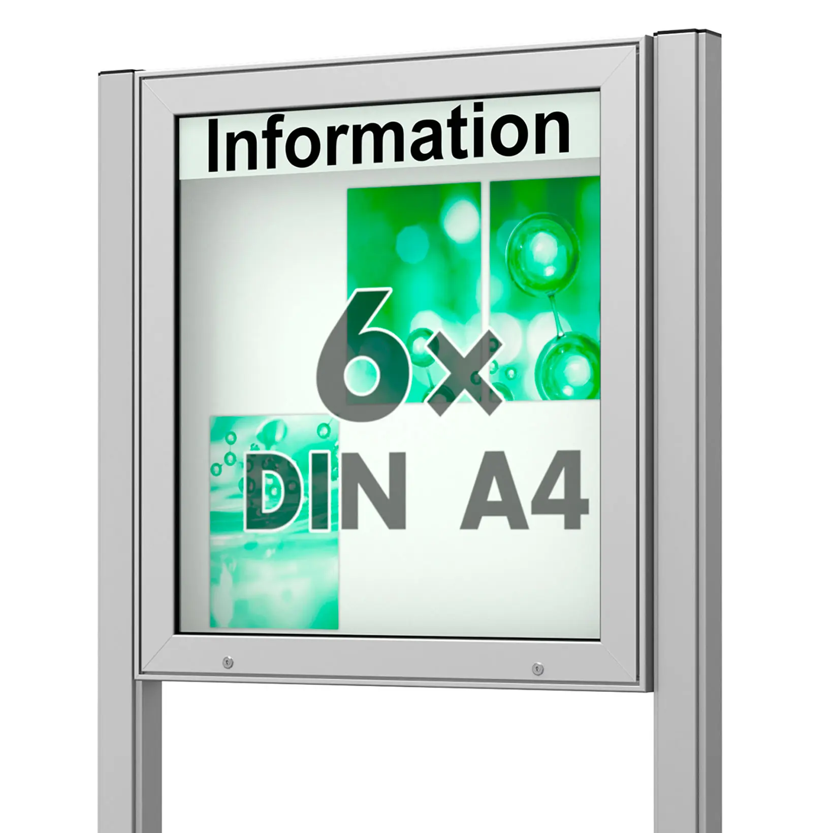 Schaukasten Plenum - eckig - "der Klassiker" - mit Pfosten und Solarbeleuchtung - 65 mm Gehäusetiefe - wetterfester, robuster Schaukasten - Größe B/H6 × DIN A4 • 760 × 830 mmOberfläche - Eloxierung in matt-silber (E6/EV1)Beleuchtung – mit LED-LangfeldleuchteÖffnung - Nach oben öffnender Klappflügel, unterstützt durch Gasdruckfedern mit automatischer Arretierung in geöffneter StellungVerglasung - Einscheiben-Sicherheitsglas / ESG Textblende - unbeschriftete, weiße Acryl-TextblendeSchließung - Sicherheitsschlösser mit je 2 SchlüsselnMontage - mit Standbeinen zum Einbetonieren oder AufdübelnRückwand - weiße, magnethaftende Rückwand mit 10 MagnetenSchaukasten Solar-ModulDer Anschluss einer herkömmlichen Schaukasten-Beleuchtung an das öffentliche Stromnetz ist mit hohem Aufwand und erheblichen Kosten verbunden. Insbesondere dann, wenn mehrere Meter Gehweg- oder Straßenoberflächen aufgebrochen und neu erstellt werden müssen. Der Stromnetz-Anschluss entfällt beim SOLAR - Modul vollständig, daher rentiert sich die Anschaffung oft schon ab dem ersten Betriebstag!Solarpanel-Typ: Monokristallines Schaukasten Solar-Modul, optimiert für den Betrieb in Niedervolt-Systemen Solarpanel-Leistungsgarantie: 90% der Maximalleistung für 10 Jahre 80% der Maximalleistung für 25 Jahre Stromversorgung: Großzügig dimensionierte Puffer-Akkus, inkl. Laderegler und Tiefentladeschutz Leuchtdauer bei Dauerbeleuchtung: bis zu 31 Stunden* Leuchtdauer bei normalem Betrieb: bis zu 1.800 Schaltzyklen* bei 60 Sekunden Leuchtdauer je Zyklus LED-Leuchten: LED-Leisten mit einer mittleren Lebensdauer von 50.000 Stunden und Einbau-Längen von 50, 100 oder 150cm (abhängig von der Schaukastenbreite) Annäherungssensor: Infrarot-Bewegungsmelder mit 120° Erfassungswinkel, individuell einstellbar Ausrichtung Das Modul ist um 360° drehbar und sollte für einen optimalen Betrieb beschattungsfrei und direkt nach Süden ausgerichtet werden.